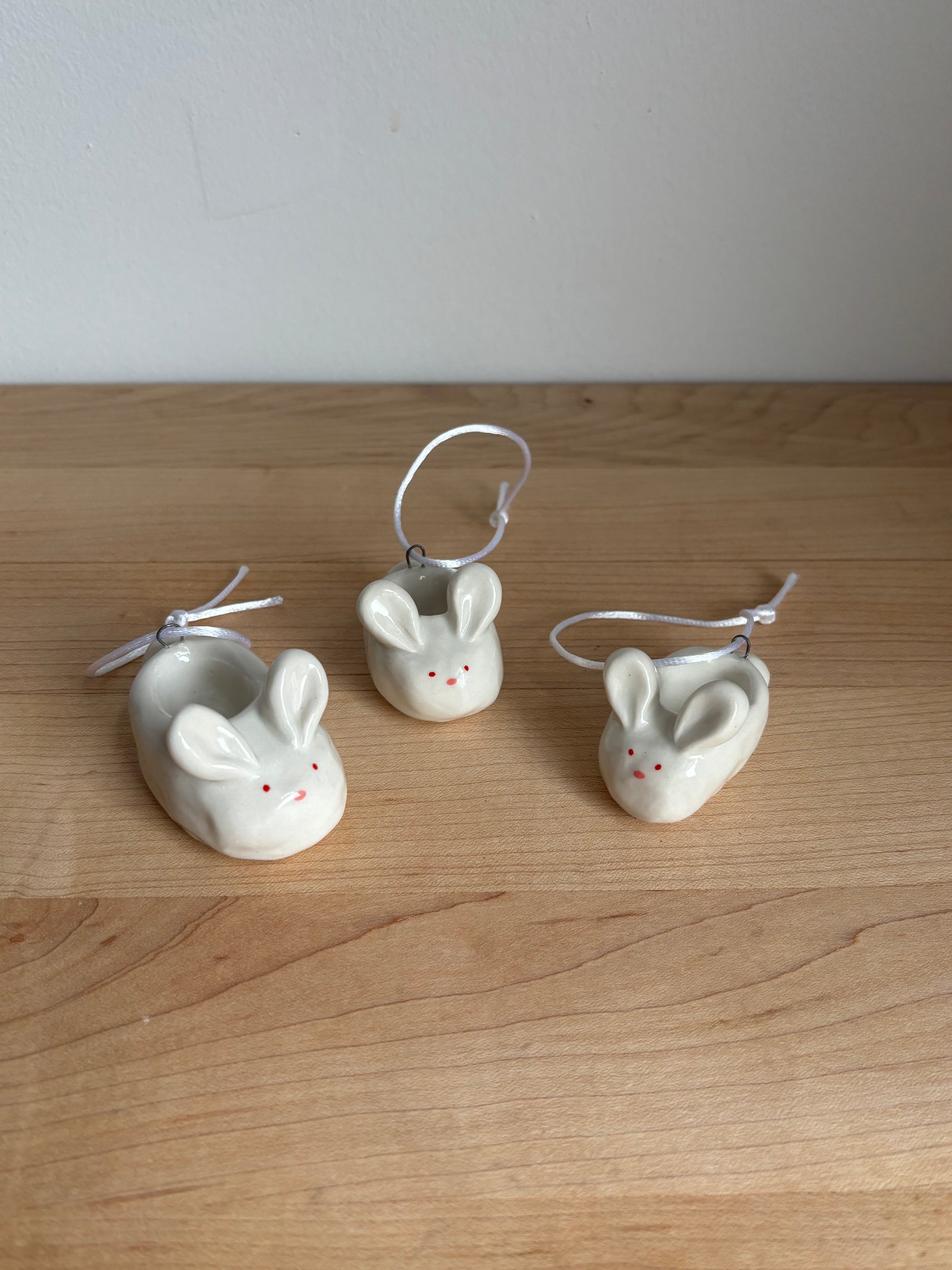 Little porcelain bunny slipper to hang from your tree or in your window or from the mirror of your car or on an altar or anywhere else you’d want to hang it🐰
